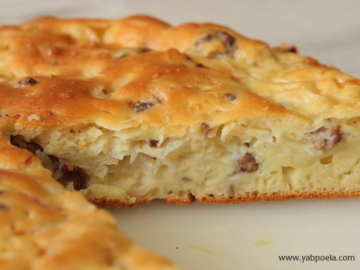 Простий заливний пиріг з м'ясним фаршем та капустою. Найвдаліше заливне тісто, яке підходить під будь-які інші начинки. Дуже смачний заливний пиріг готується легко та просто. Така випічка дуже популярна у господинь, тому що дозволяє заощаджувати час проведений на кухні. А ще підходить для тих, хто не любить возитися із тістом.