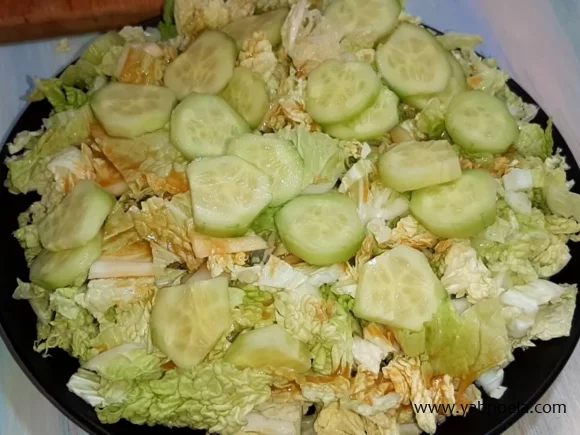 Нарізаємо пекінську капусту, викладаємо на блюдо для подачі.